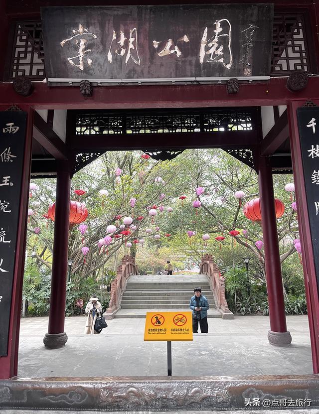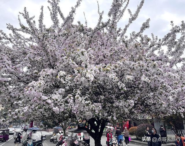 棠湖公园,位于成都双流的老城区,以海棠花和湖泊为核心,为双流最早、最悠久的市政园林公园。从地铁3号线,东升站D1口出来,沿棠湖东路步行10分钟左右,穿过充满生活气息的老街,便来到公园的正大门。大门左前方有一树粉白色繁花,那便是垂丝海棠,是今年开花最早的海棠树,也是一棵网红树,吸引了不少游客驻足打卡拍照。