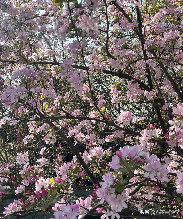 一进入公园,里面的静谧与秀美,和外面的车水马龙形成明显对比。一阵淡淡的清香迎面袭来,让人神清气爽。我朝着垂丝海棠的区域走去。这里的垂丝海棠较多,一片一片的。海棠馆前的垂丝海棠,我个人觉得最有园林的意境。它们古朴苍劲,盛开的粉白海棠花与飞檐翘角的建筑相映成趣,尽显古韵之美。茂密的枝条交织在一起,形成了一条天然的长廊。漫步其中,仿若走进了万花筒般。沿着观光道前行,湖边的海棠春坞、金花桥,再到九曲桥、亭周边,处处都是垂丝海棠的身影。