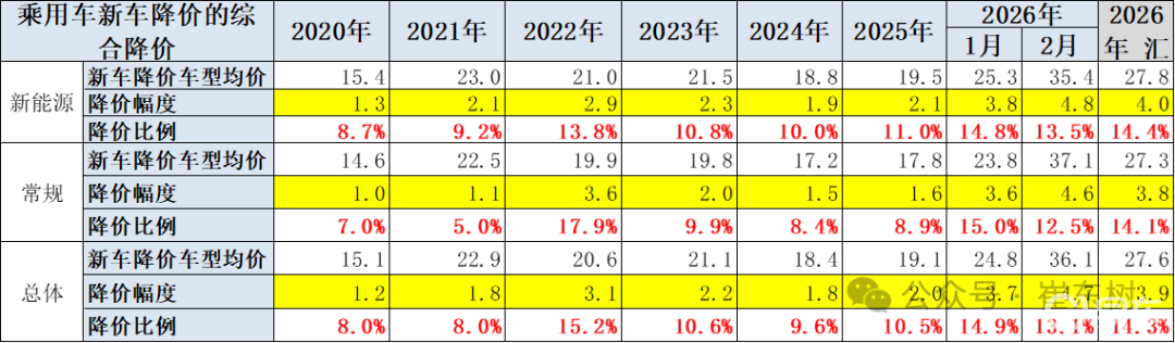 日前,乘联分会秘书长崔东树公布了2月车市的价格变动情况。新能源乘用车新车降价车型均价35.4万元,降价力度算术平均4.8万元,降价幅度达13.5%,处于较高水平;常规燃油乘用车新车降价车型均价37.1万元,降价力度算术平均4.6万元,降价幅度达12.5%。2026年2月总体乘用车市场新车降价车型均价36.1万元,降价力度算术平均达到4.7万元,降价幅度达到13.1%。
