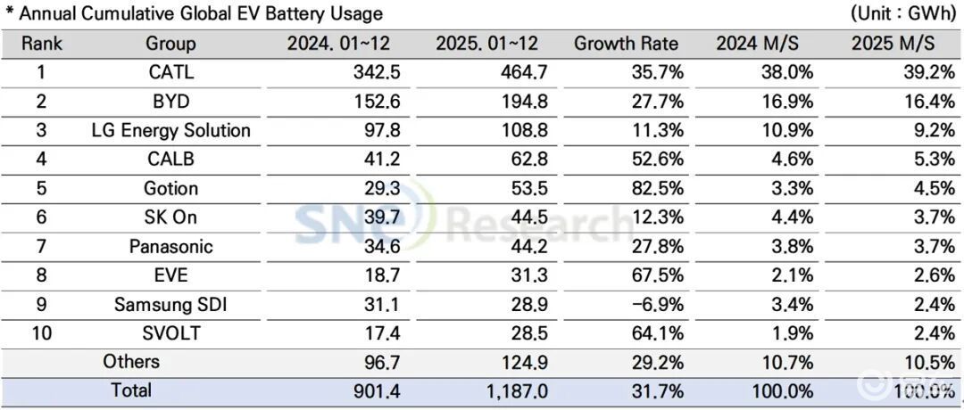 韩国市场分析机构SNE Research发布的数据显示,2025年全球上牌的电气化车辆(含油混、插混、纯电)动力电池装车量合计达1,187GWh,同比增长31.7%,延续了近年来的较高增长态势。从全球动力电池装车量排名前十的企业名单来看,中国企业继续占据主导地位,坐拥6个席位,分别是宁德时代、比亚迪、中创新航、国轩高科、亿纬锂能、蜂巢能源,市占率合计首次达到70.4%。